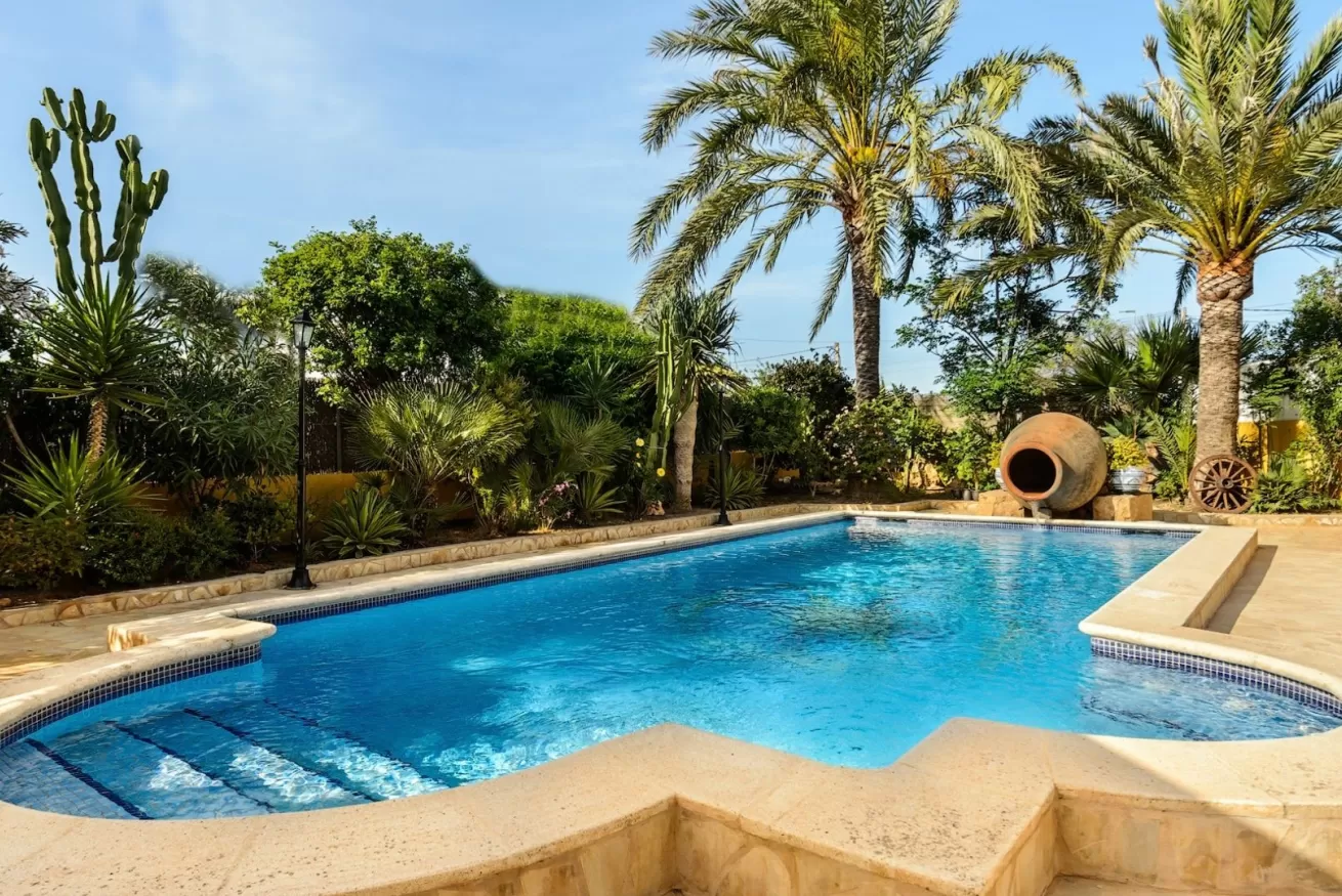 The outdoor area is a triumph of vibrant colors and nature: the pool, surrounded by comfortable sun loungers, is enriched by a fountain in the form of a precious terracotta-colored classical style vase.