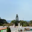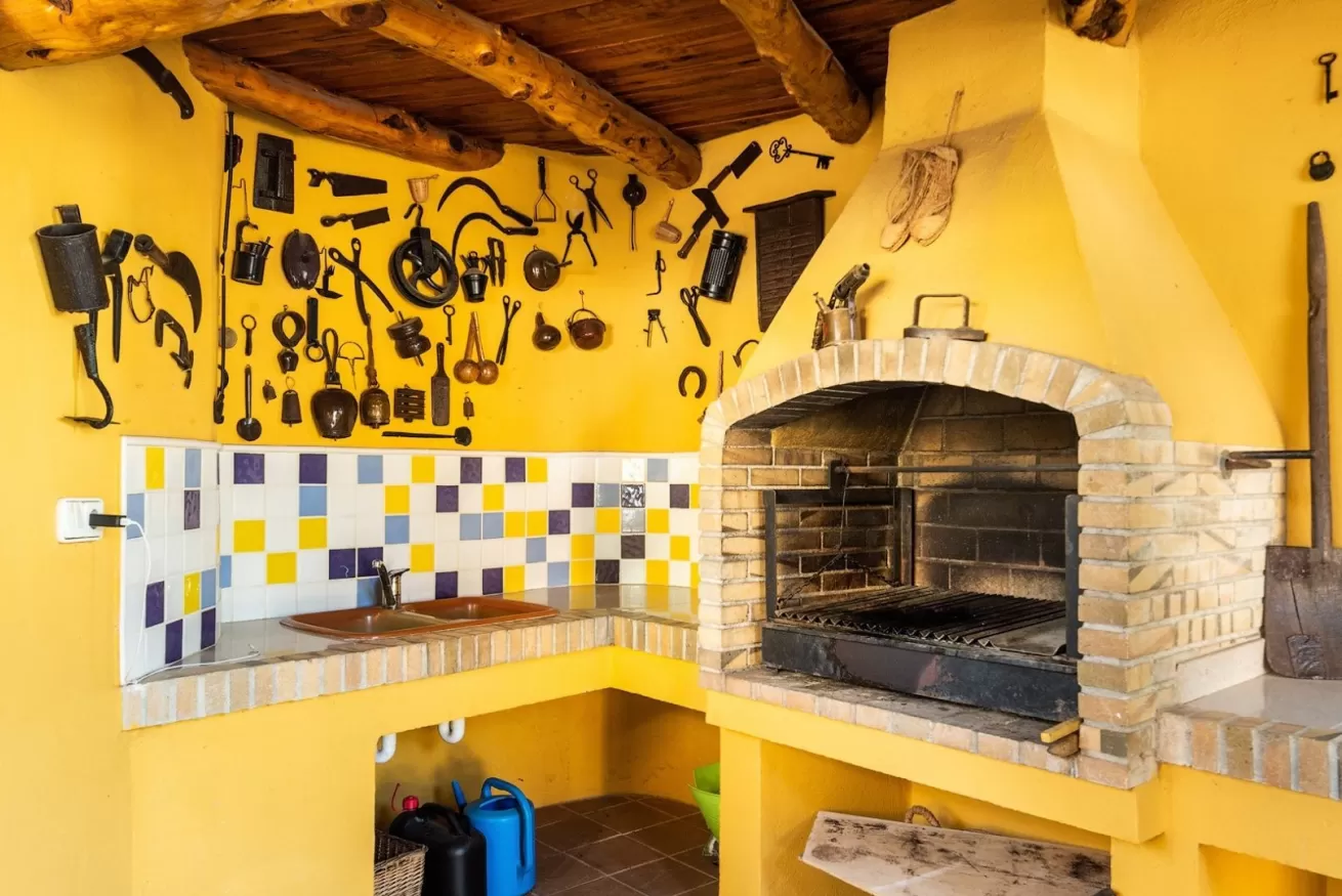 To the side, on the left, there is a very functional BBQ area, just behind a very special arch composed of two white columns supporting a wooden beam.