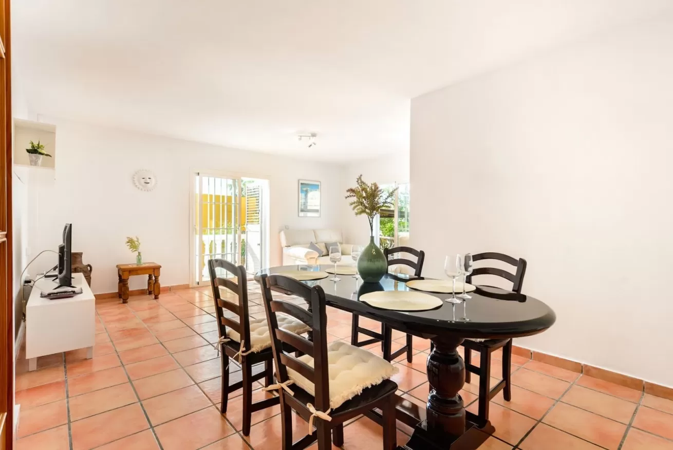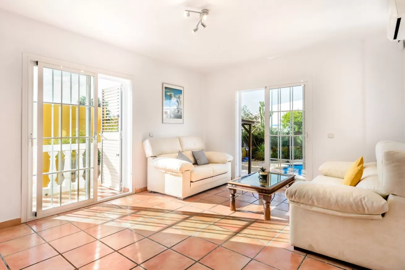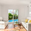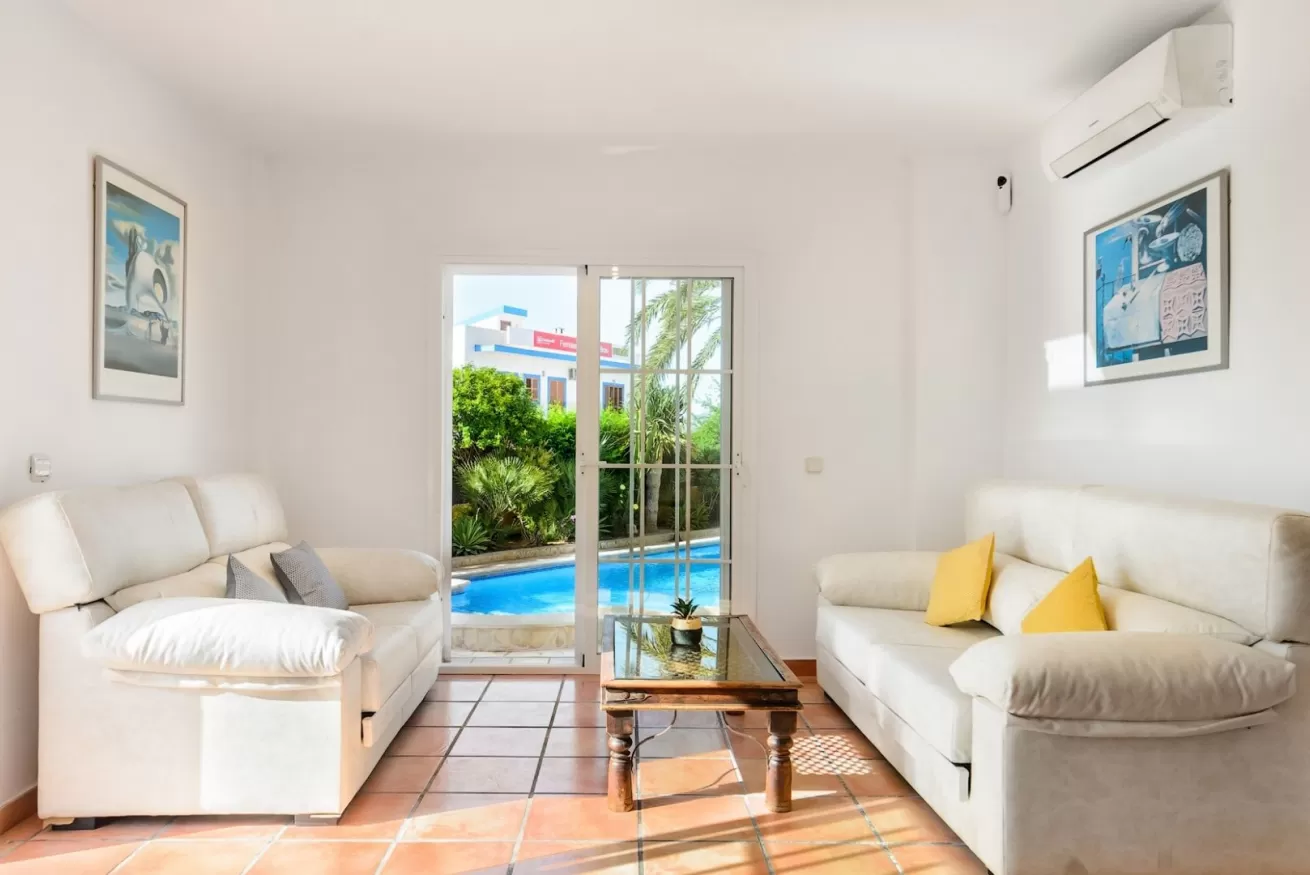 From here you can access the interior of the house: the living area is very bright thanks to the large windows that perimeter it. From the sofas you have a wonderful view of the pool and the TV, and to the side a dining table. The atmosphere is pleasant, given by the combination of earth tones and soft colors.