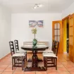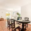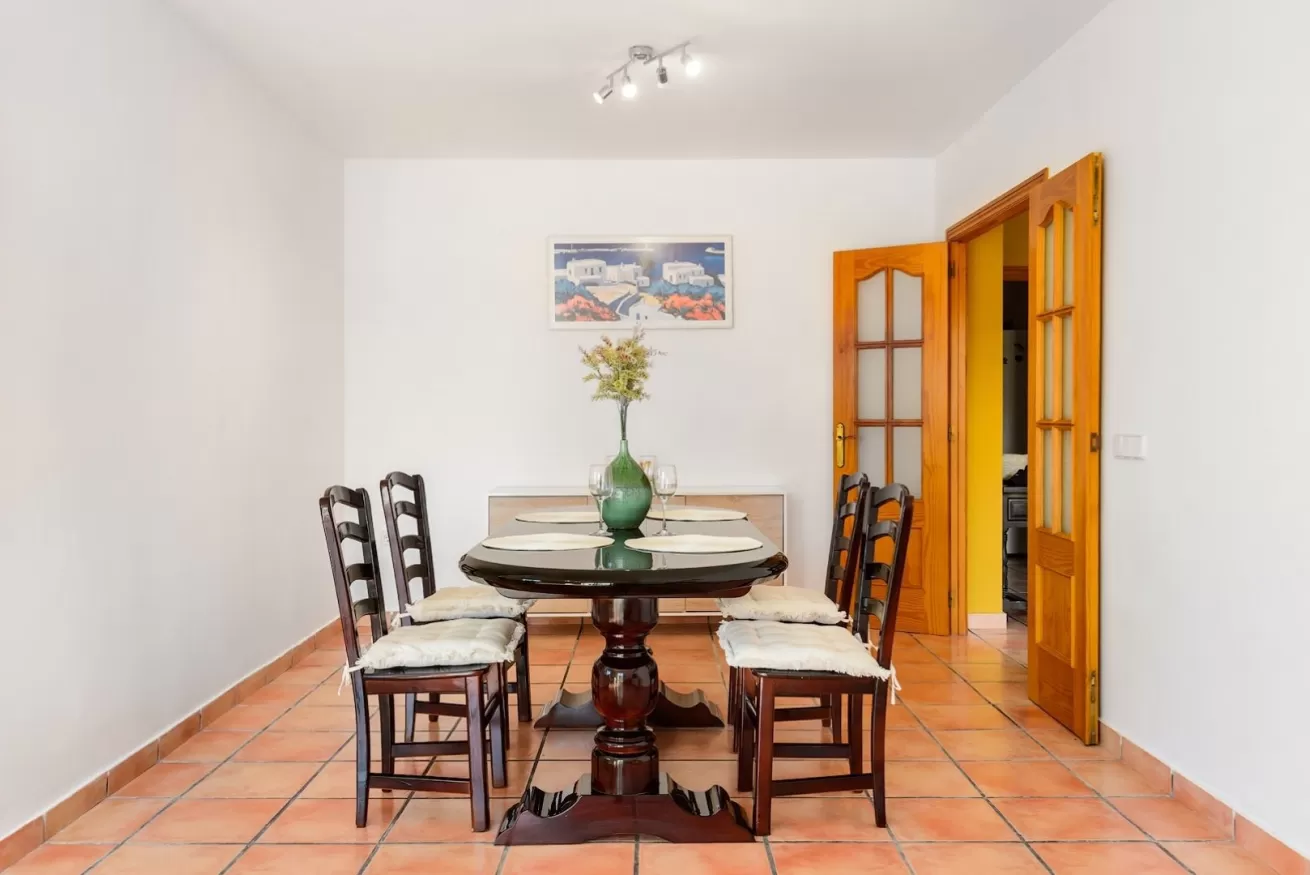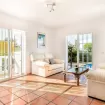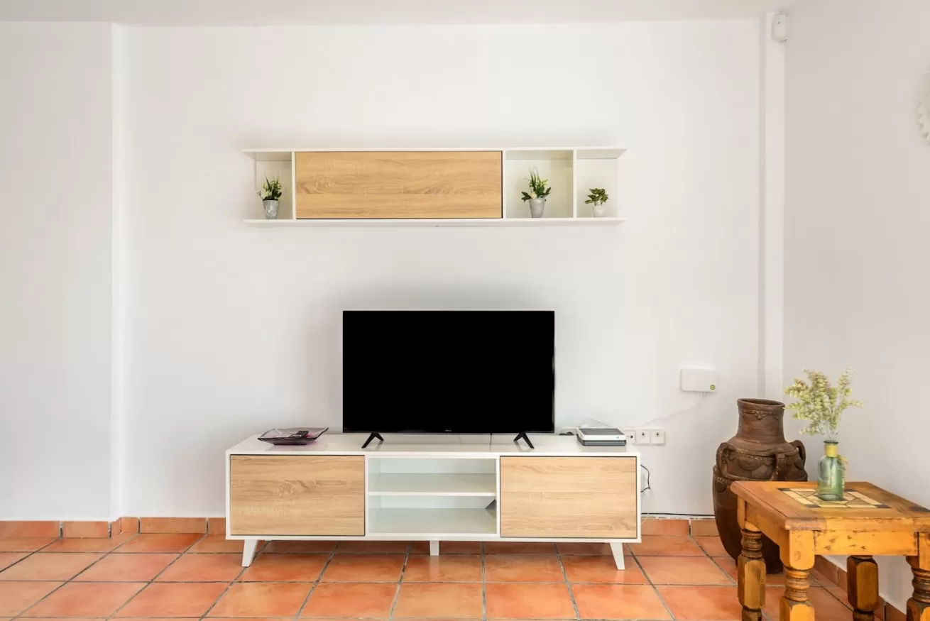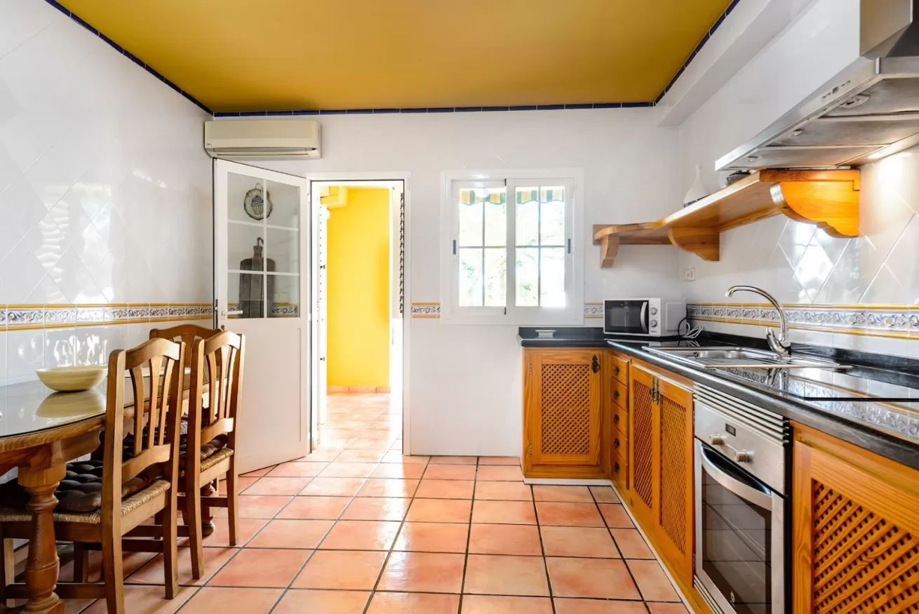 From here you can access the interior of the house: the living area is very bright thanks to the large windows that perimeter it. From the sofas you have a wonderful view of the pool and the TV, and to the side a dining table. The atmosphere is pleasant, given by the combination of earth tones and soft colors.