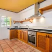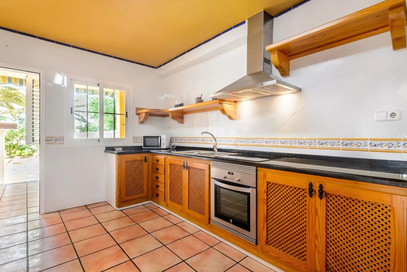 Continuing on you enter the kitchen, which is functional and cozy: large and equipped with every comfort, the colors of wood and dark marble prevail, both in the kitchen itself and in the table and chairs that are in front of the cooktop. From the kitchen there is a second direct access to the pool area and a small chill-out area with chairs and small table.