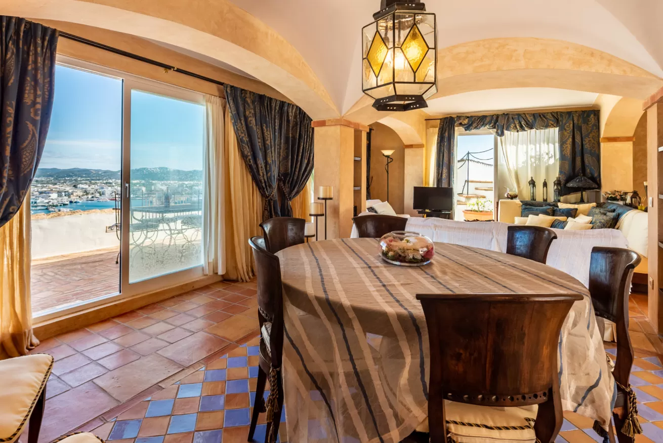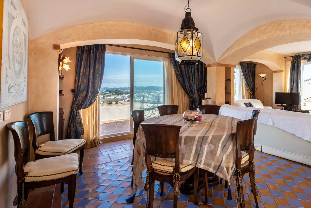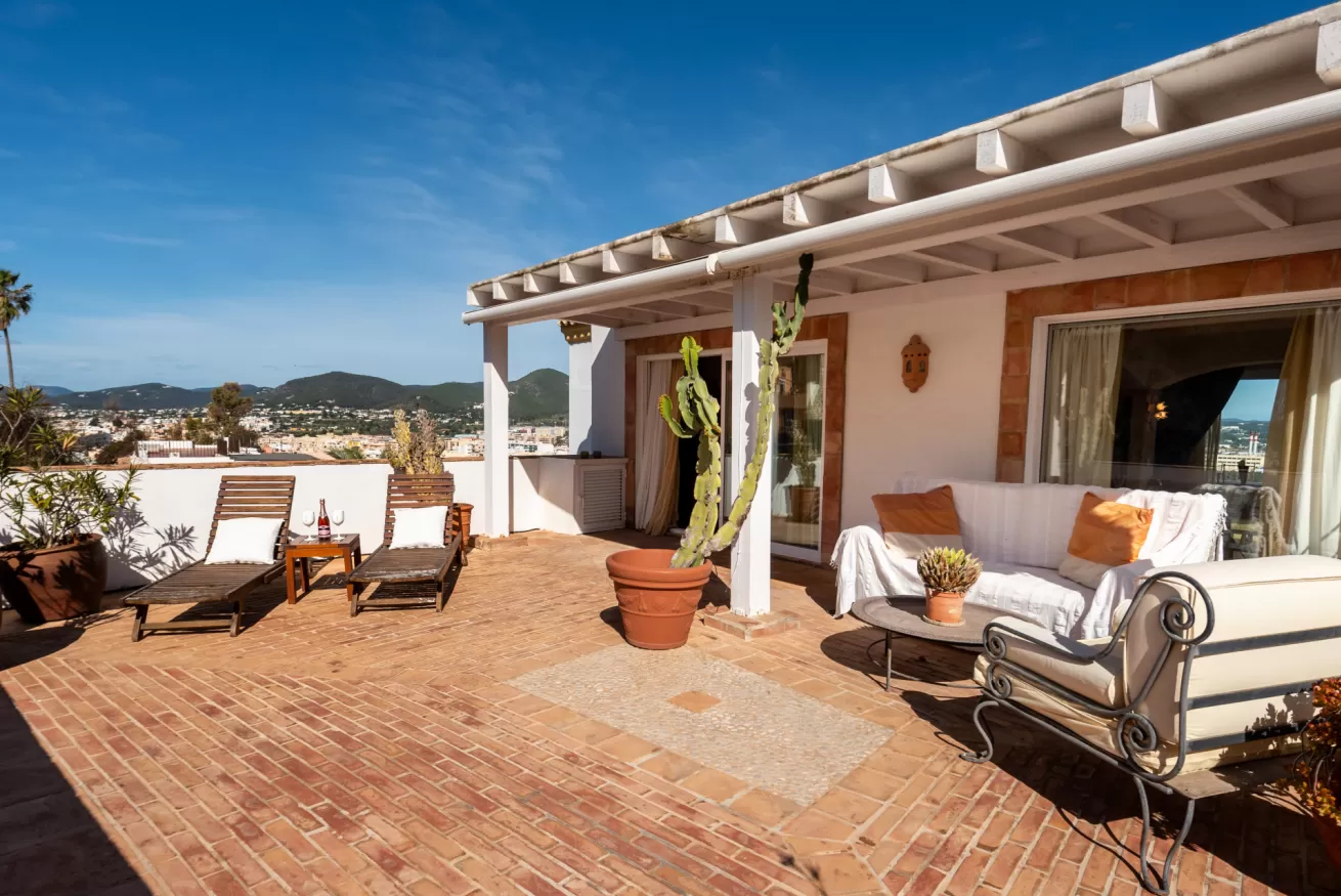 From the living area you have access to the terrace, divided mostly into two areas: the first, with sun loungers and sofa to enjoy the hot Ibizan sun with incredible views of the city and the sea, and the other with outdoor dining area where you will feel like watching a panoramic painting.