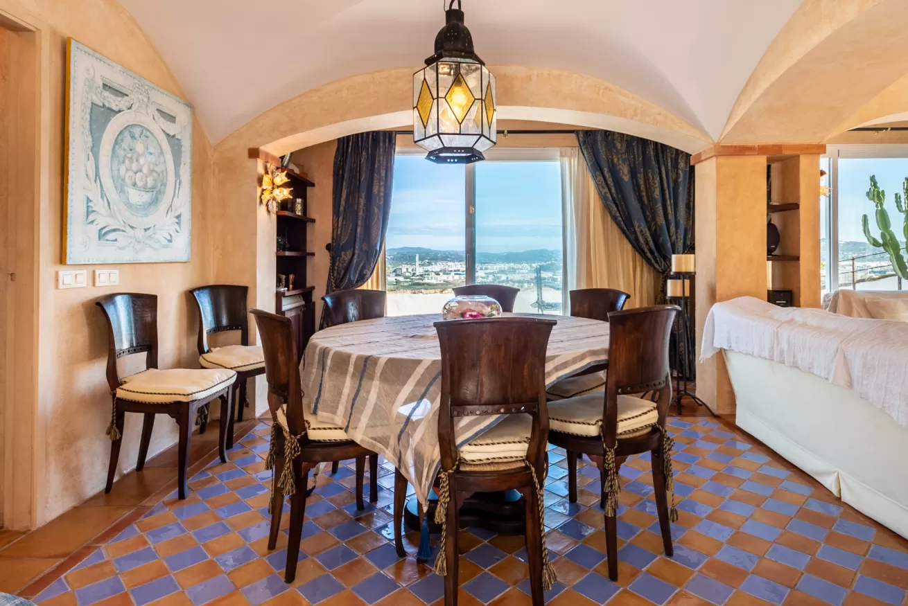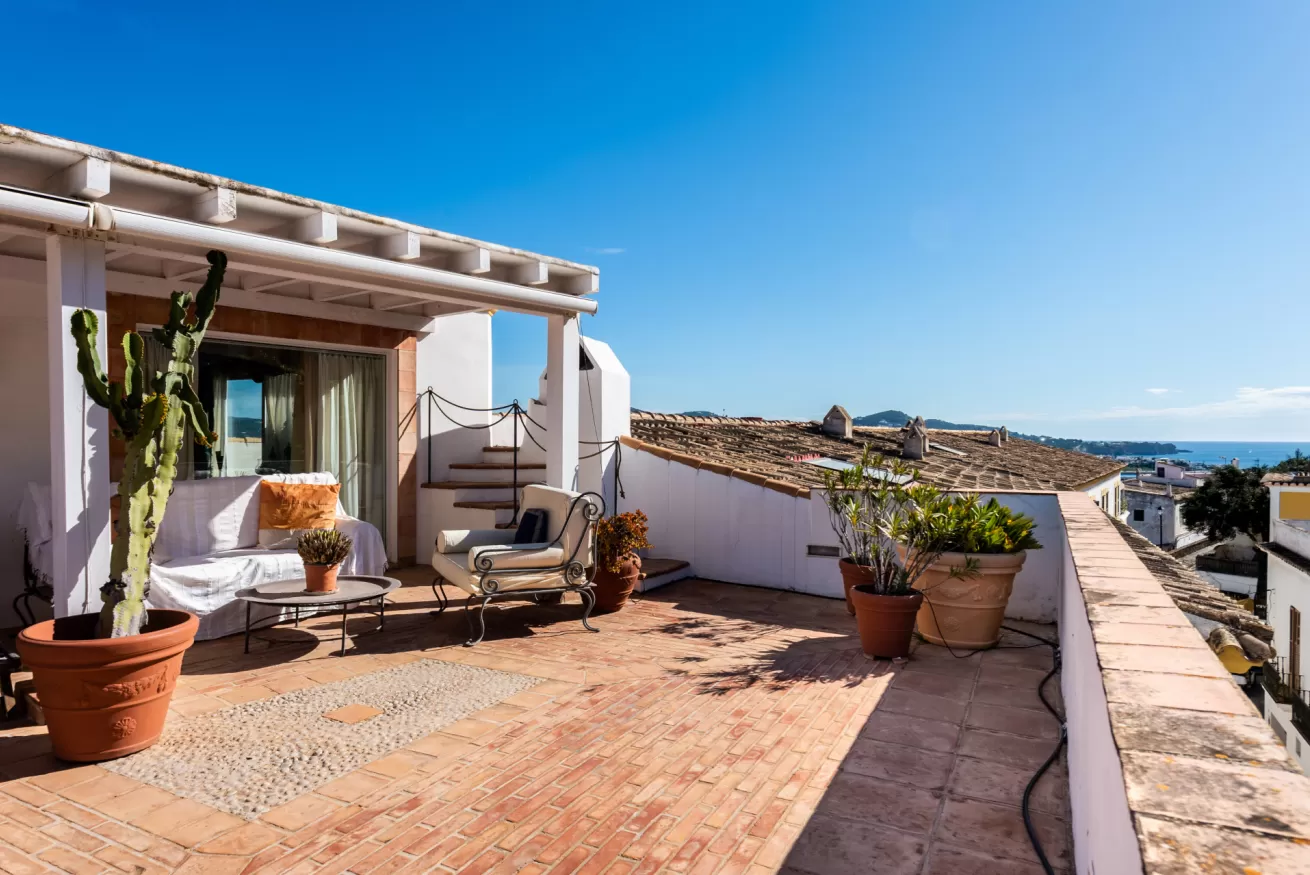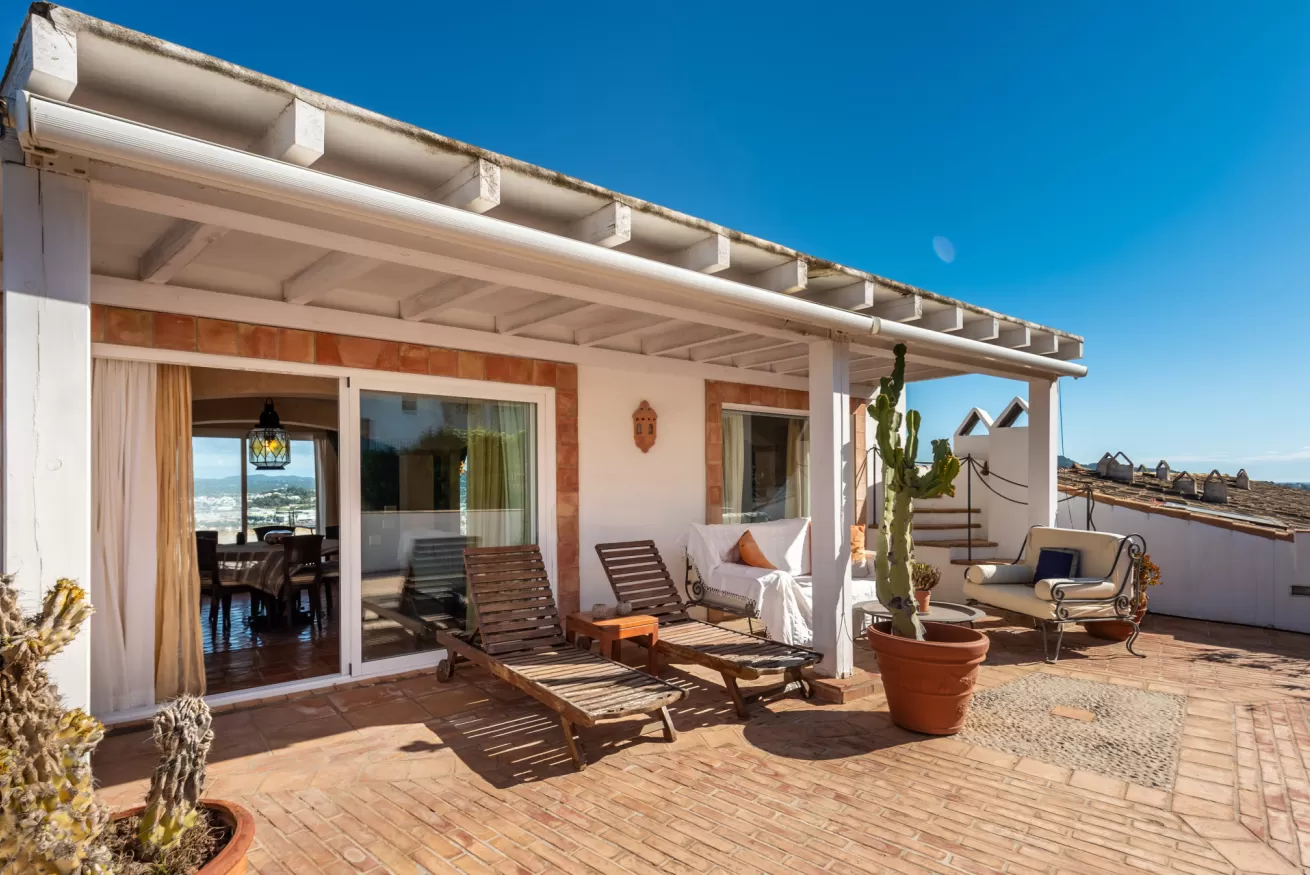 From the living area you have access to the terrace, divided mostly into two areas: the first, with sun loungers and sofa to enjoy the hot Ibizan sun with incredible views of the city and the sea, and the other with outdoor dining area where you will feel like watching a panoramic painting.