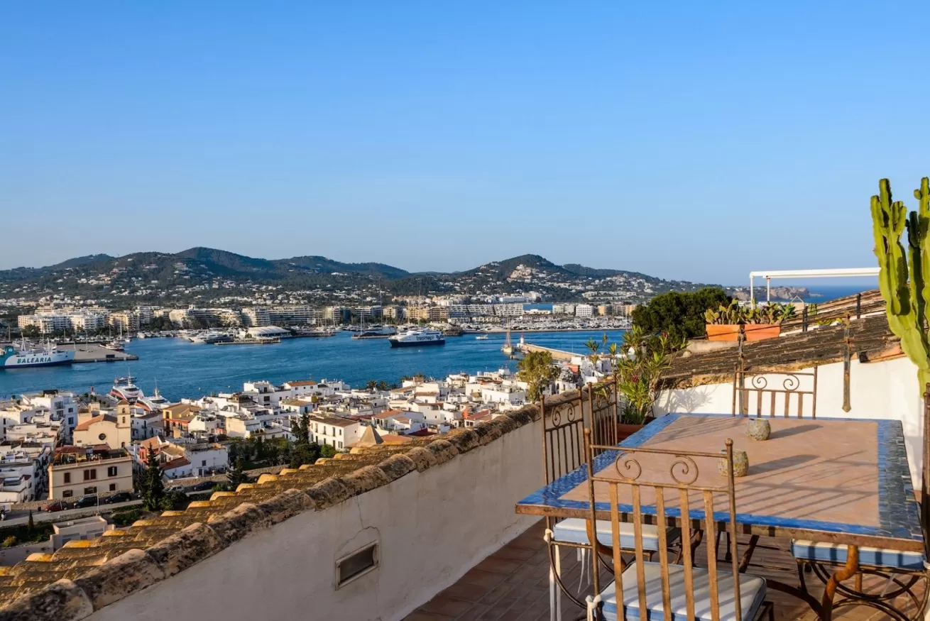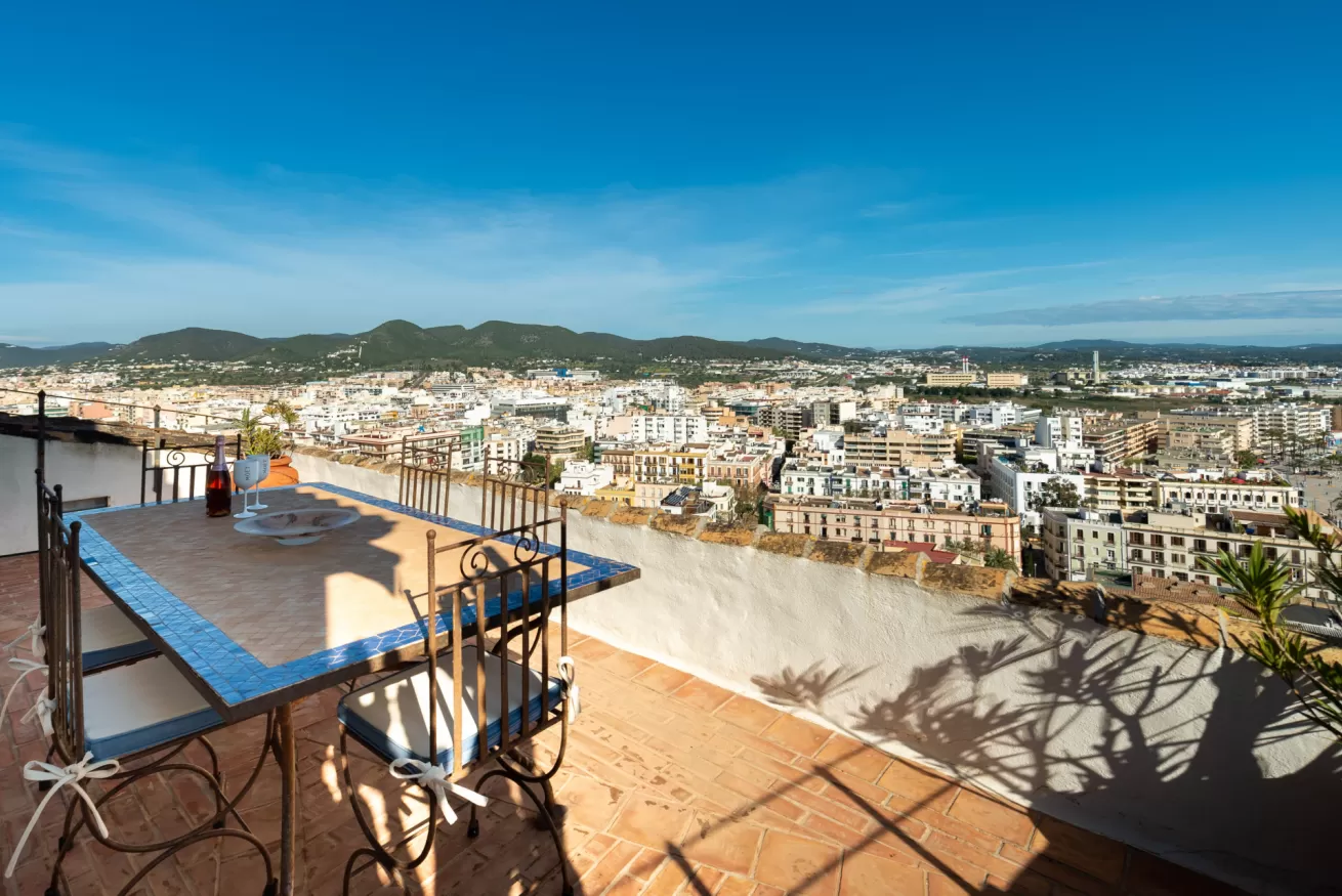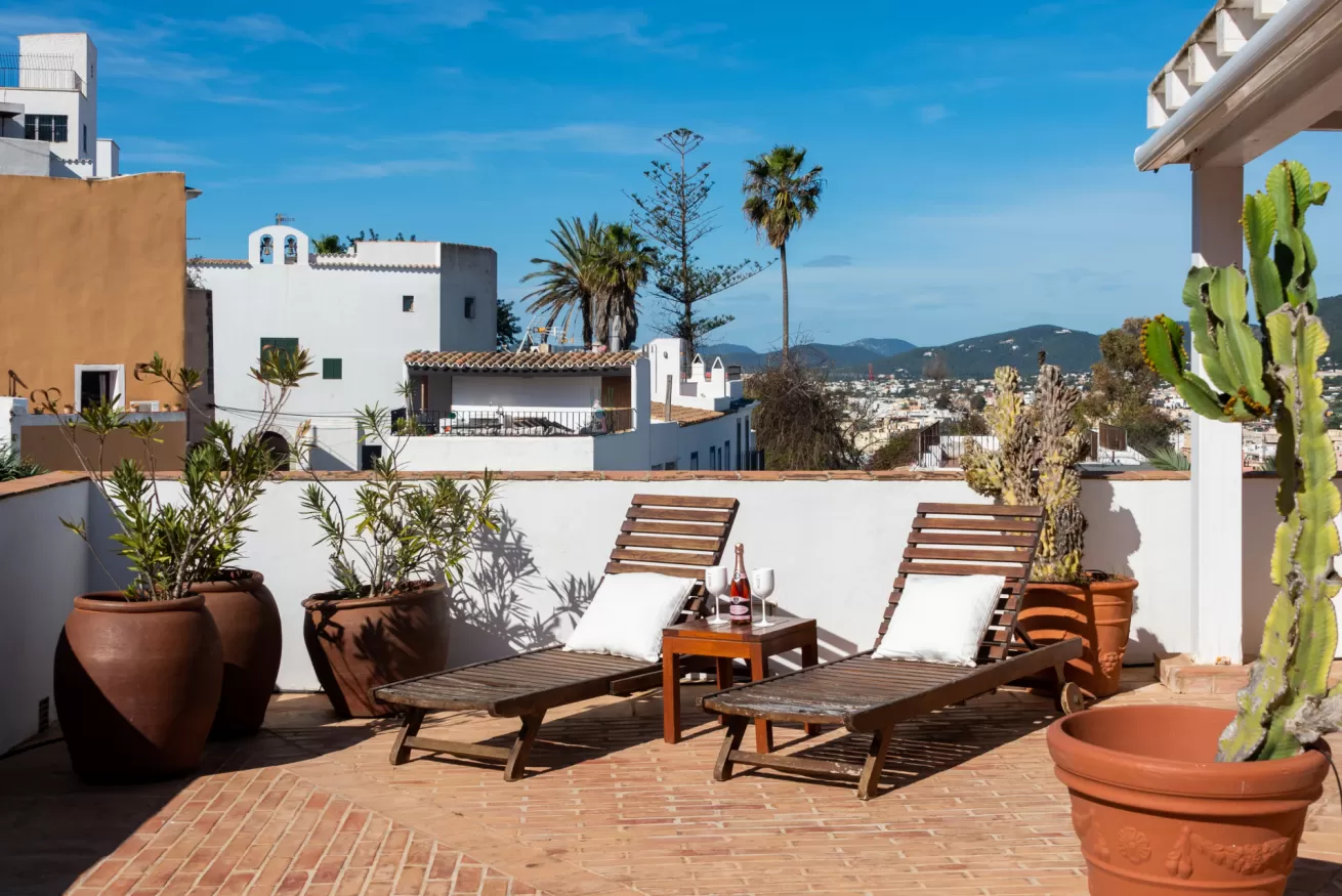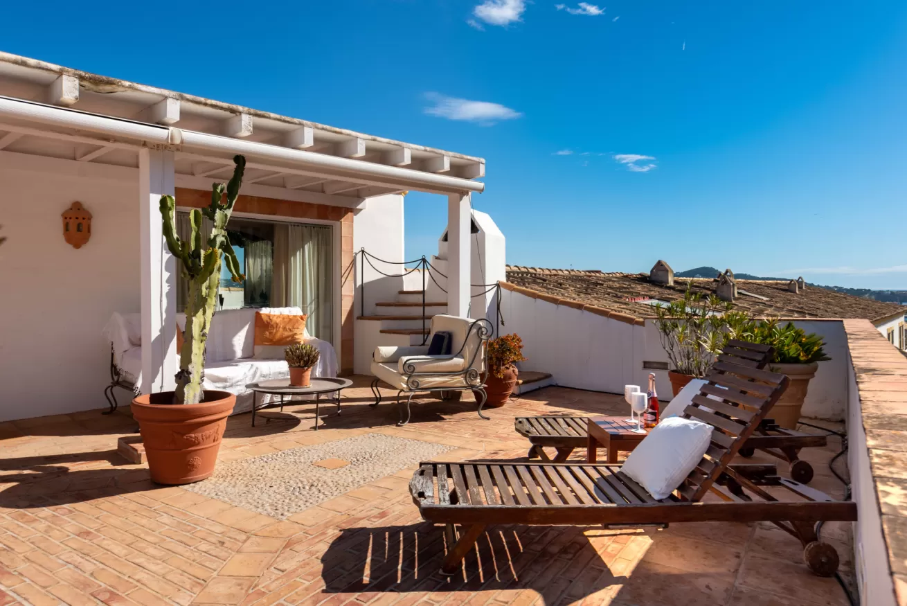You can wake up in the morning and start the day with a wonderful view of the sea from the highest point of Dalt Vila, take a walk in the center, have a cocktail in one of the many bars in the streets of the Port or opt for a glass of wine at home, by the pool.