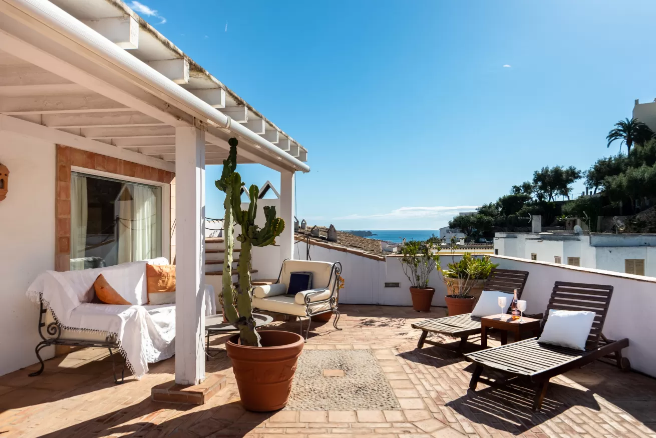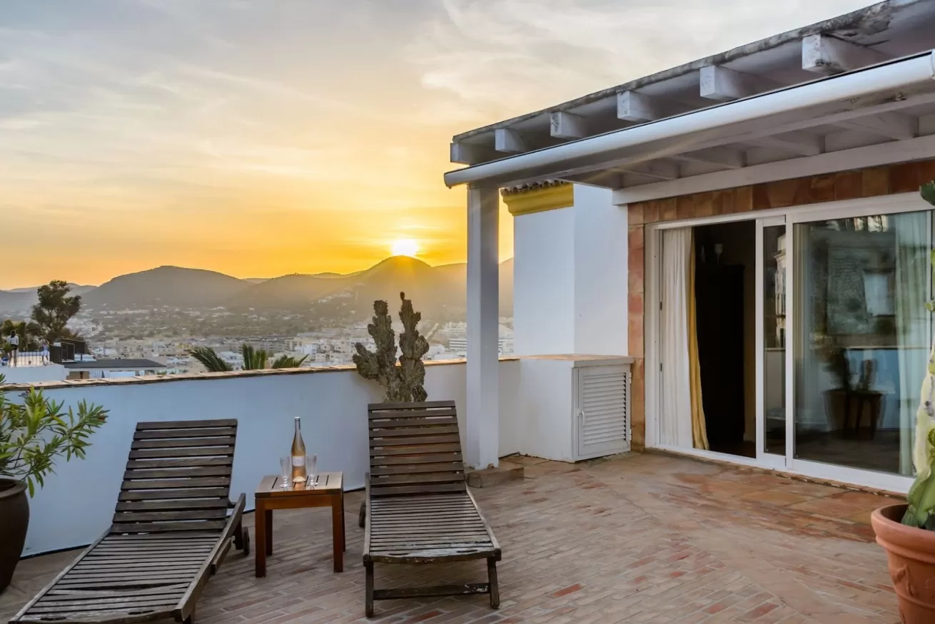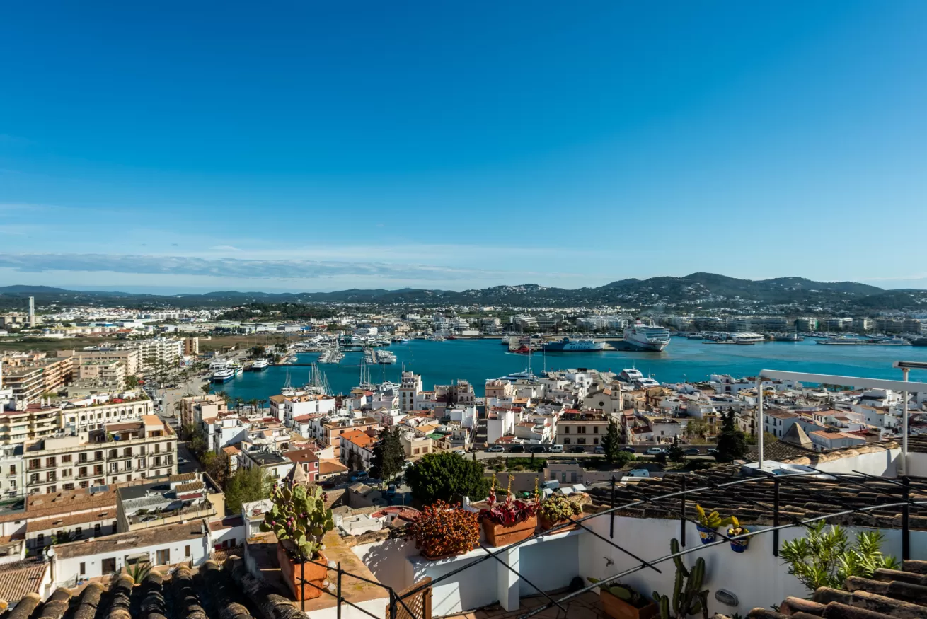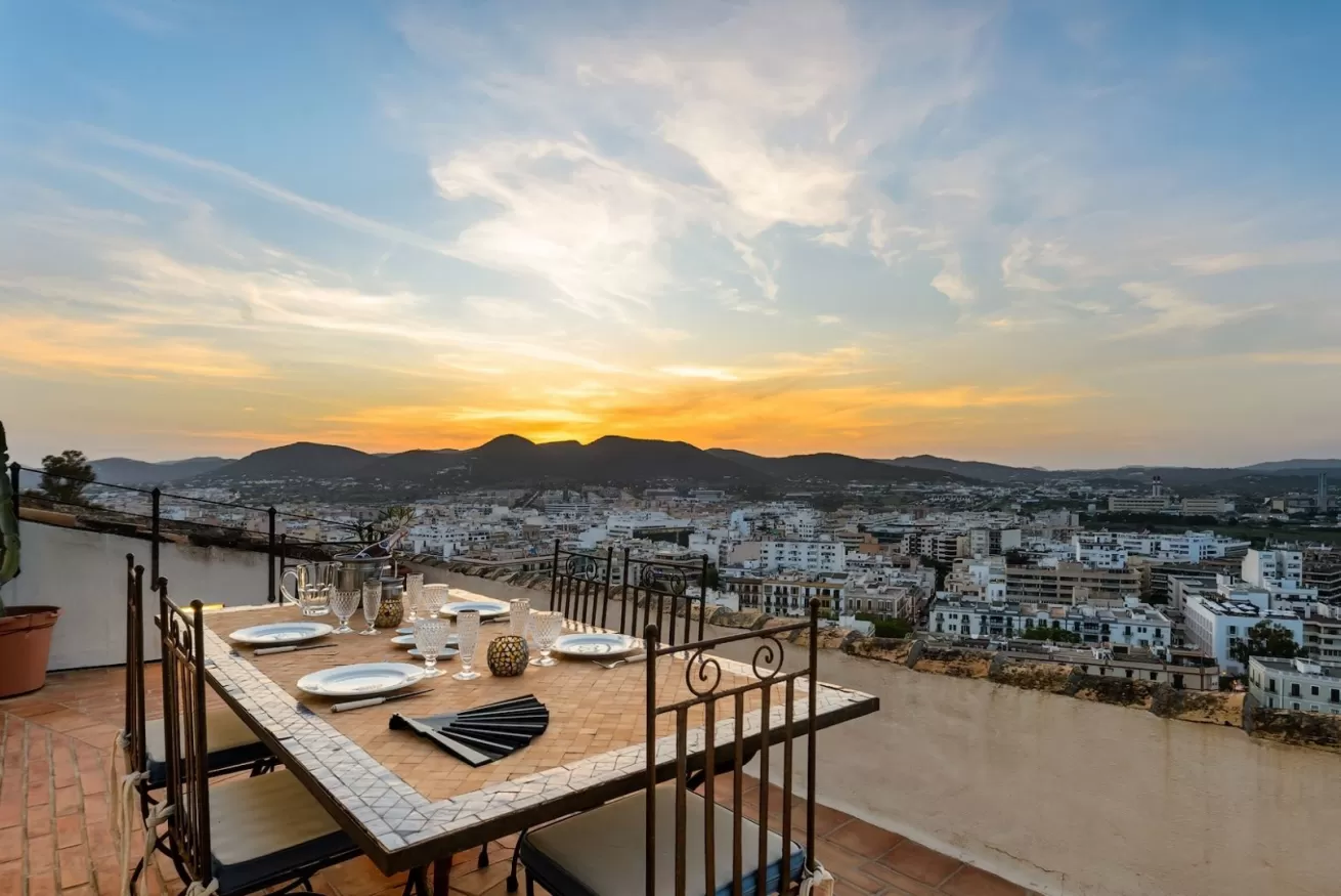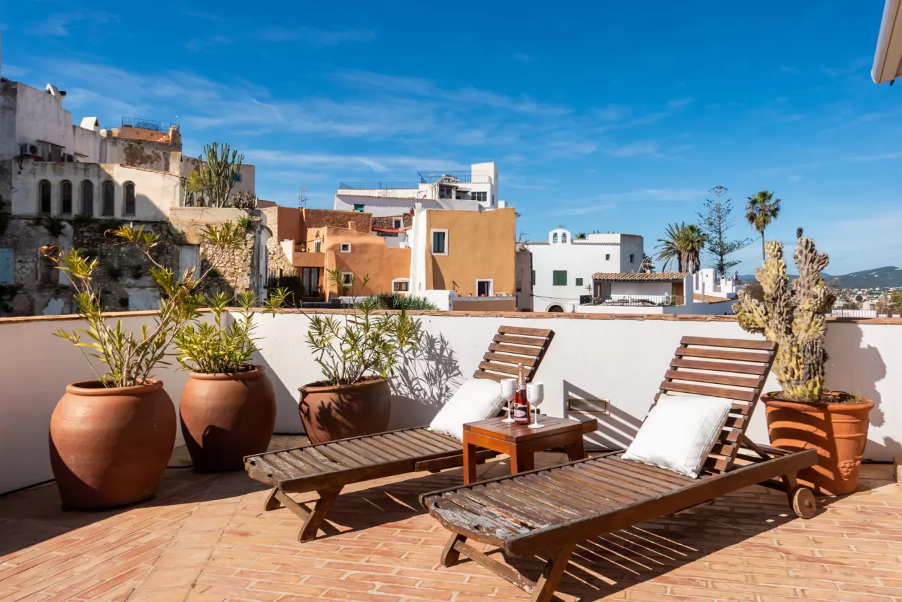 You can wake up in the morning and start the day with a wonderful view of the sea from the highest point of Dalt Vila, take a walk in the center, have a cocktail in one of the many bars in the streets of the Port or opt for a glass of wine at home, by the pool.